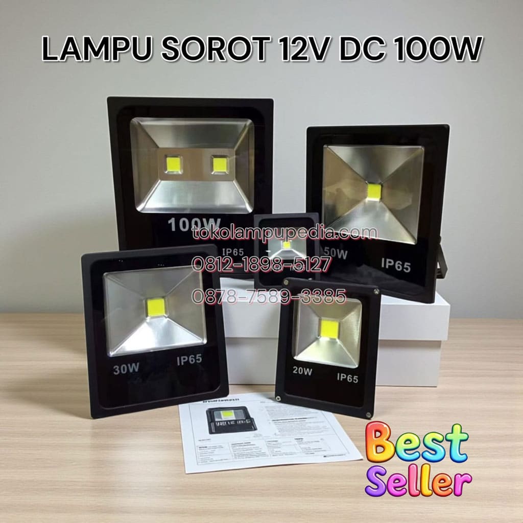 Lampu Sorot LED 12V DC 100W Terbaru, mata LED chip onboard, tersedia 10w, 20w, 30w, 50w & 100w dapat menggunakan aki atau tenaga surya.